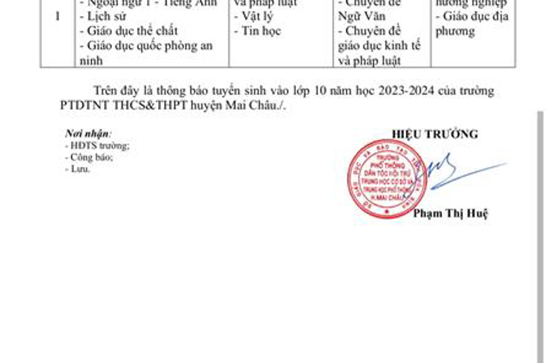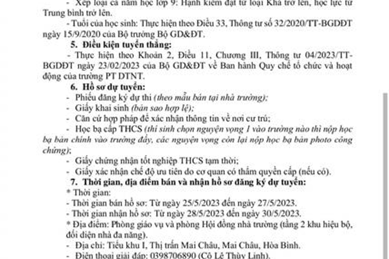 Thông báo điểm thí sinh dự thi vào 10 Trường PTDTNT THCS và THPT huyện Mai Châu năm học 2022 - 2023