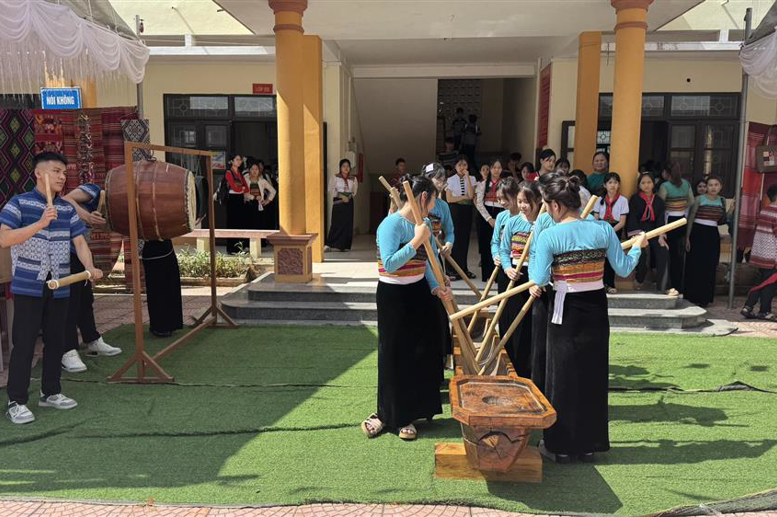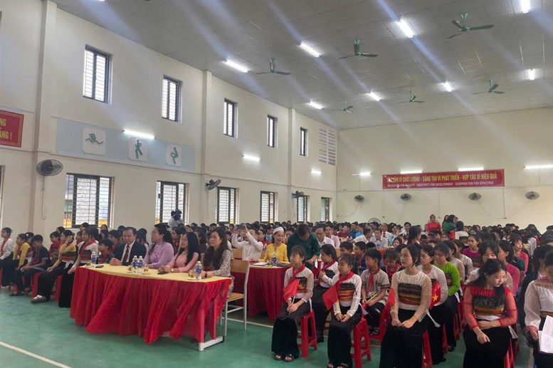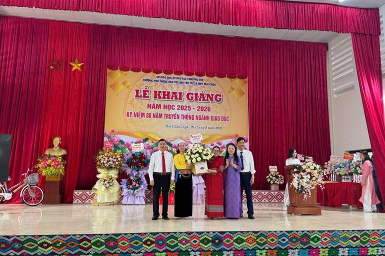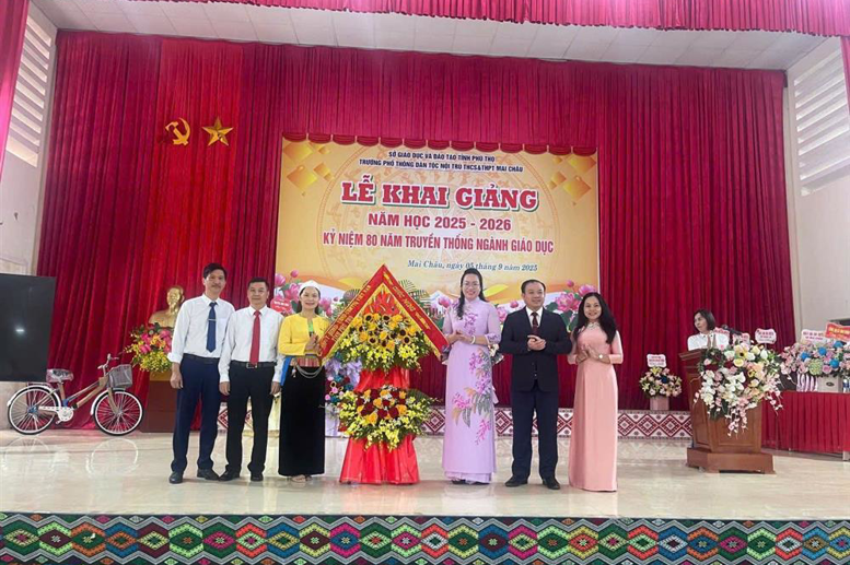 Trong không khí phấn khởi, trang trọng và ấm áp, nhà trường vinh dự được đón tiếp các đồng chí đại biểu: Đ/c Nguyễn Hồng Nhung, TUV, Phó Chủ tịch Ủy ban MTTQ Việt Nam tỉnh kiêm Chủ tịch Hội Liên hiệp phụ nữ tỉnh, Đồng Chí Hà Văn Di TUV Bí thư Đảng Ủy, Chủ tịch HĐND xã Mai Châu, Lãnh đạo Hội LHPN tỉnh Phú Thọ, Lãnh đạo trường Chính Trị tỉnh Phú Thọ, Lãnh đạo các xã Tân Mai, Pà Cò, Bao La, Mai Hạ, Lãnh đạo VNPT tỉnh Phú Thọ, Ngân hàng Chính sách xã hội Mai Châu, ngân hàng Agribank Mai Châu, Ban đại diện hội CMHS nhà trường cùng đông đảo phụ huynh học sinh đến tham dự . Bên cạnh phần Lễ , không gian Ngày hội khai trường thêm phần phong phú với các gian hàng trưng bày của Câu lạc bộ giữ gìn bản sắc văn hóa các dân tộc kết hợp với Chi đoàn giáo viên, gian hàng của các lớp. Đặc biệt, các tiết mục văn nghệ, màn nhảy sạp sôi động và điệu múa Keeng loóng truyền thống đã mang đến bầu không khí rộn ràng, đậm đà bản sắc dân tộc. Tiếng trống khai trường được vang lên từ hội trường Trung tâm hội nghị Quốc Gia của đồng chí Tô Lâm Tổng bí thư Đảng cộng sản Việt Nam hứa hẹn một năm học mới nhiều thành công và đột phá mới.Dưới đây là một vài hình ảnh của buổi lễ