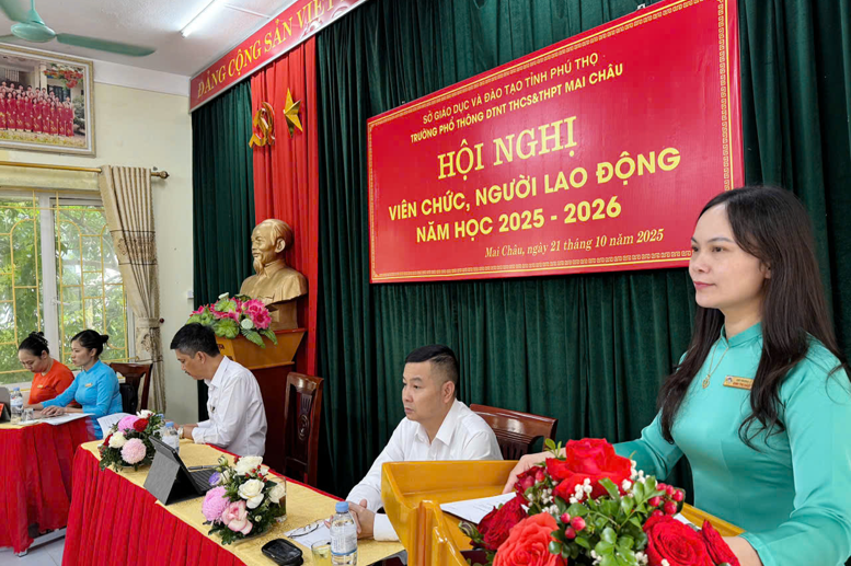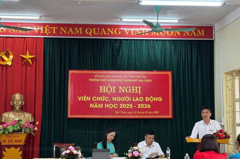 Thực hiện Hướng dẫn số 08/HD-SGD&ĐT, ngày 10/10/2025 của Sở Giáo dục và Đào tạo tỉnh Phú Thọ về việc tổ chức Hội nghị cán bộ, công chức, viên chức, người lao động trong các cơ sở giáo dục thuộc tỉnh Phú Thọ, ngày 21 tháng 10 năm 2025, trường PT DTNT THCS&THPT Mai Châu long trọng tổ chức Hội nghị viên chức, người lao động năm học 2025–2026.